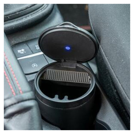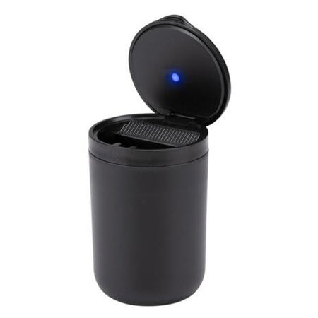 Askebæger til bilen med praktisk LED-lys i sort med låg. Ideelt askebæger til bilen, passer i næsten enhver kopholder. Men også til stranden eller haven. Askebægeret er varmebestandigt og er let at rengøre. Kopholderstørrelse, ca. 11 x 7 cm.