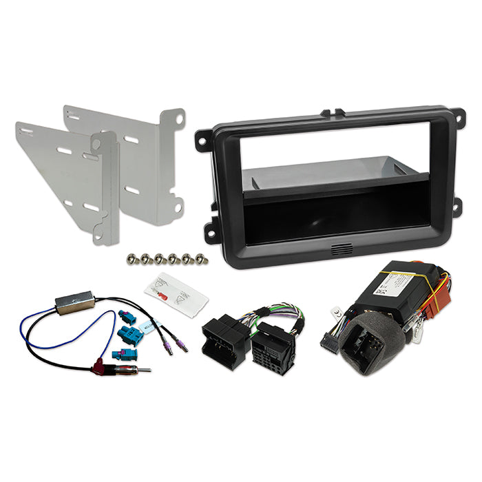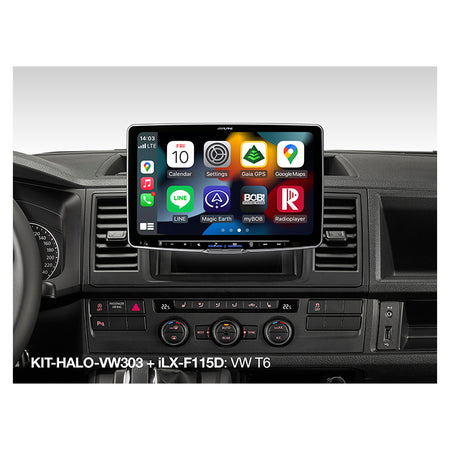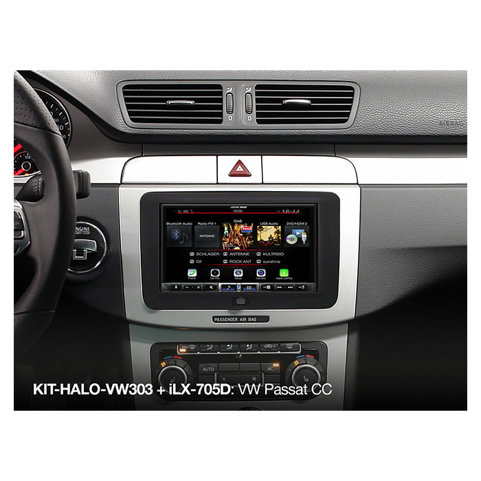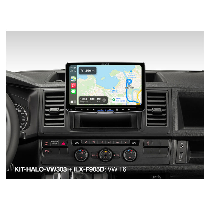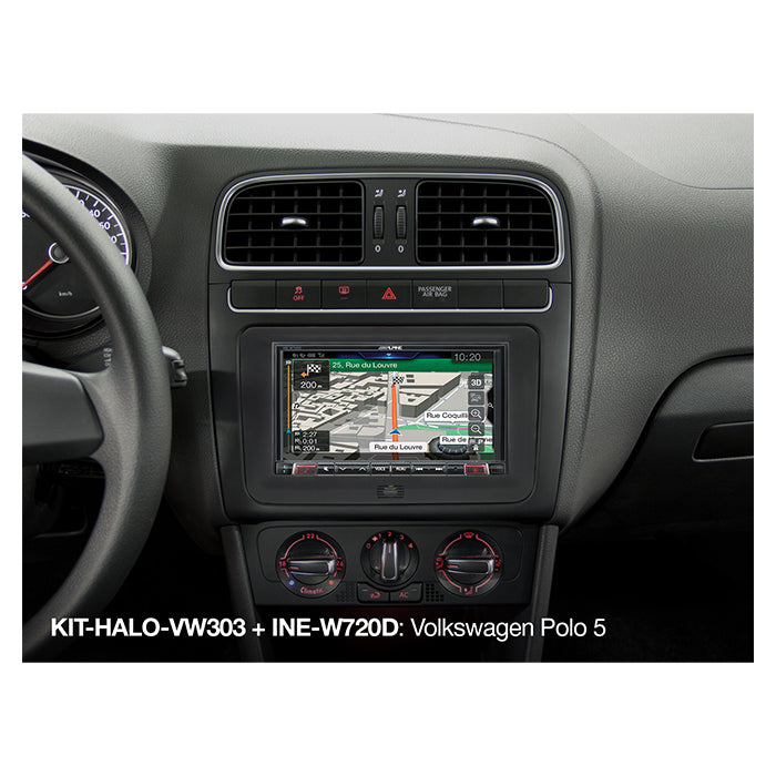 Alpine KIT-HALO-VW303 er et installationssæt designet til at integrere Alpine Halo 1-DIN og 2-DIN hovedenheder i kompatible Volkswagen-, Seat- og Skoda-køretøjer. Sættet sikrer en problemfri installation og bevarer bilens originale funktioner, herunder ratbetjening og visuelle parkeringsassistenter.