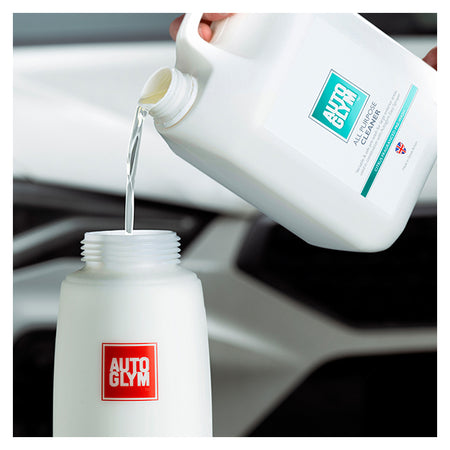 All Purpose Cleaner er den ultimative løsning til både interiør og eksteriør. Uanset om du kæmper med snavs i motorrummet, pletter på sæderne eller insektrester på lakken, leverer denne alsidige rengøringsmiddel en dybdegående, men skånsom rengøring. Den er effektiv nok til at fjerne selv genstridigt snavs, men mild nok til sarte overflader som krom, læder, ruskind og Alcantara. Den har fremragende affedtningsegenskaber, så den er perfekt til snavsede motorrum, dør- og bagagerumsfalser og brændstofpåfyldningen.