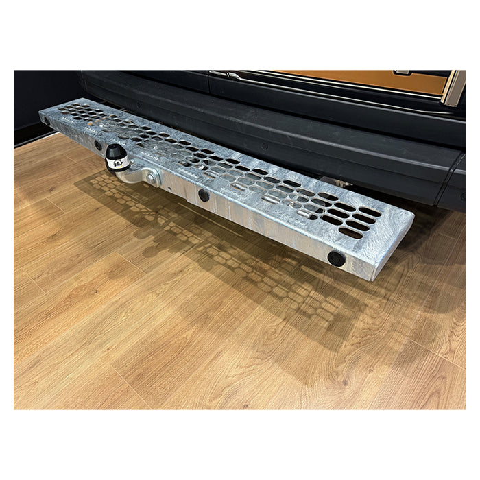 Praktisk trinbræt til varevogne hvor flangekuglen monteret ude på trinnet. Giver nem og sikker adgang til varerummet, reducerer belastning ved ind- og udstigning og beskytter bilens bagende mod stød og ridser.