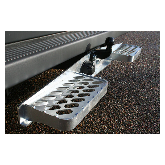 Praktisk trinbræt til varevogne med anhængertræk. Giver nem og sikker adgang til varerummet, reducerer belastning ved ind- og udstigning og beskytter bilens bagende mod stød og ridser.