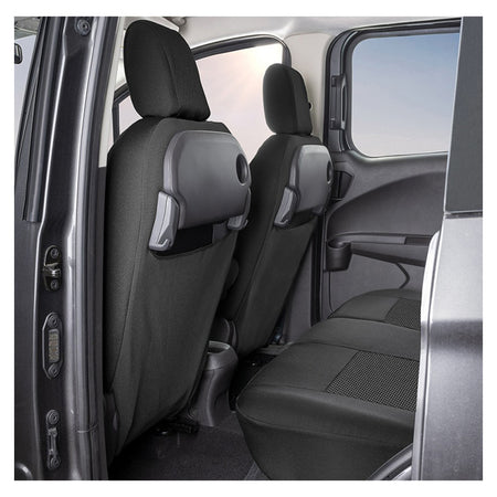 Disse sædeovertræk beskytter bilens originale polstring mod slid og skader, mens det klassiske og stilrene design giver et æstetisk løft. Den afdæmpede farvekombination af sort med en diskret grå tekstur midt i betrækket passer harmonisk ind i ethvert bilinteriør. En af fordelene ved betrækkene er, at de dækker hele bagsiden af ryglænet.