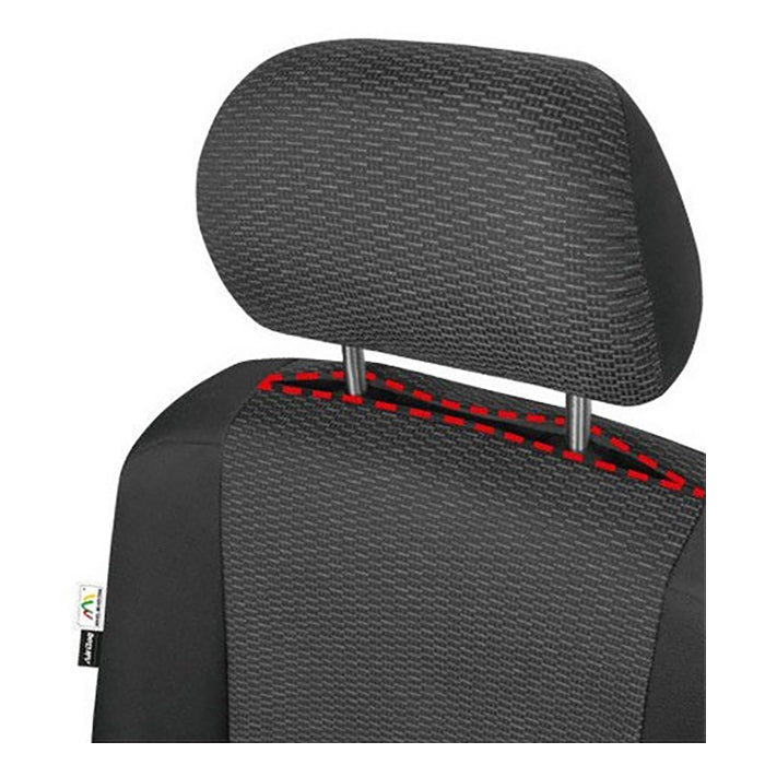 Disse sædeovertræk beskytter bilens originale polstring mod slid og skader, mens det klassiske og stilrene design giver et æstetisk løft. Den afdæmpede farvekombination af sort med en diskret grå tekstur midt i betrækket passer harmonisk ind i ethvert bilinteriør. En af fordelene ved betrækkene er, at de dækker hele bagsiden af ryglænet.