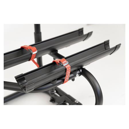 Cykelholderen monteres hurtigt og sikkert på de fleste V-formede trækstænger via et U-krogsystem. De medfølgende fastspændingsremme og rammeholdere sikrer, at cyklerne står helt fast under hele turen. For ekstra tryghed kan der tilkøbes en låsbar anti-tyveri-knop til rammeholderne.