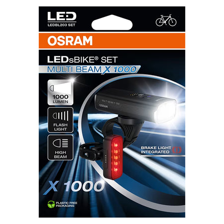Oplev kraftig og alsidig cykelbelysning med Osram LEDsBike Multi Beam X 1000 Spot. Med op til 1000 lumen og seks lysindstillinger – herunder High Beam (fjernlys) – får du klart udsyn, uanset om du kører på landevej eller i terræn. Den intelligente lyssensor justerer automatisk lysstyrken efter omgivelserne, mens baglygten med automatisk mode, blinkfunktion og bremselys øger din sikkerhed.