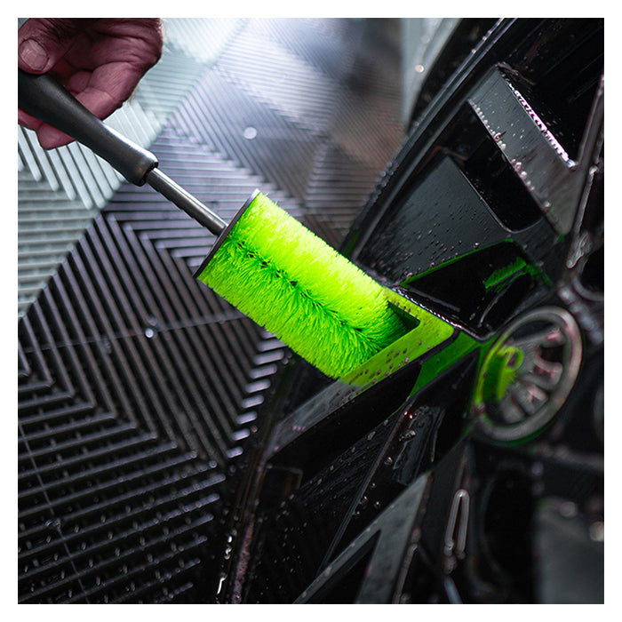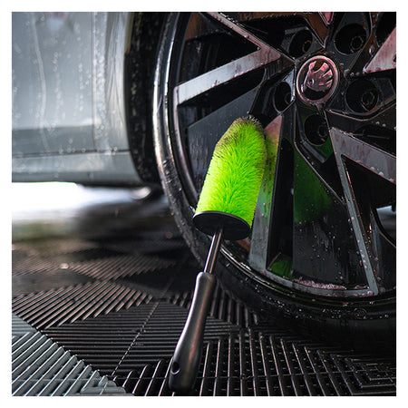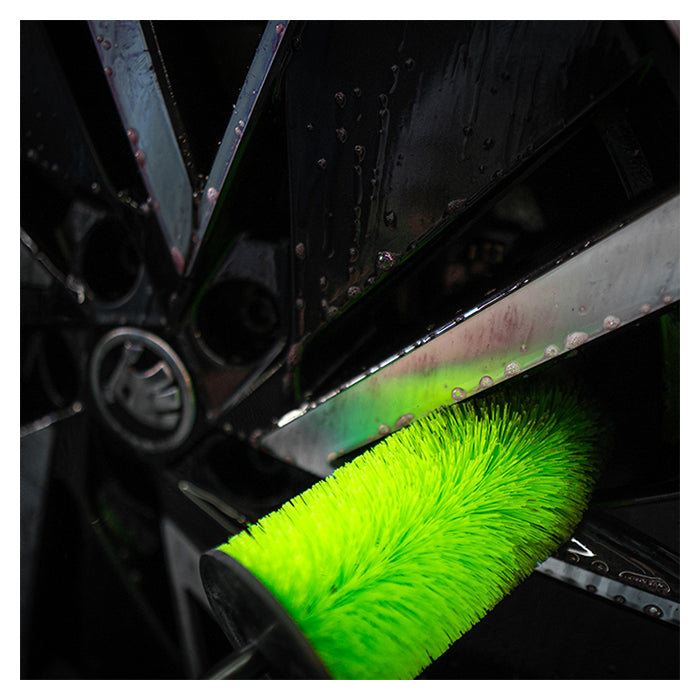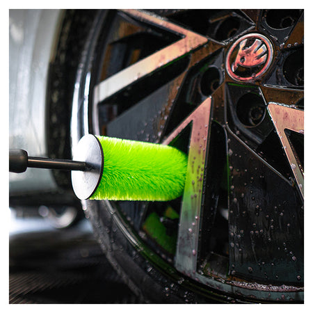 Spray fælgrens på fælgene, drej hjulet 180°, og spray igen for fuld dækning. Løs snavset med børsten, lad det virke i 3–5 minutter, og skyl grundigt med vand.