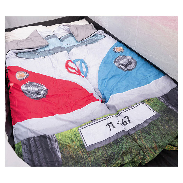 Enkelt sovepose med VW T1 motiv, perfekt til en hyggelig campingtur, eller på festival. Modellen har en rundtgående lynlås og er printet med VW Bulli frontmotiv i røde farver.